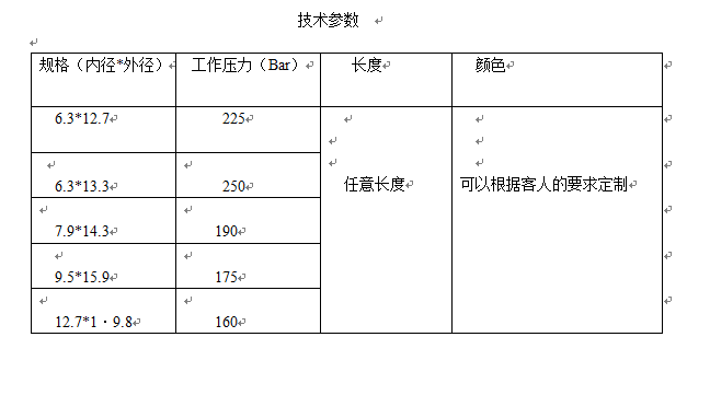 产品性能:承压能力高,脉冲性能好,流体阻力小,韧性大,弯曲半径小(弯曲性能好,不易折断),耐磨性极好,清洁度高,低膨胀率,耐老化,耐低温,耐油,脂,碱等化学药品的侵蚀,优良的耐制冷剂性能。